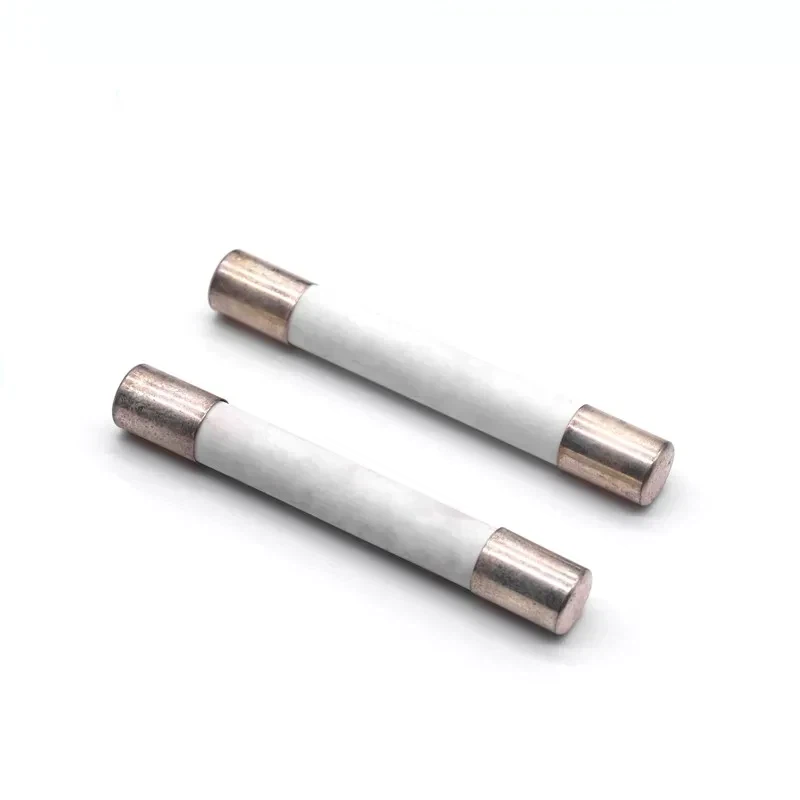 The fuse has two end caps made of metal and is constructed with a ceramic body. The metal end caps are designed to provide a secure connection to the system's wiring, and the ceramic body provides insulation and protection against high temperatures.